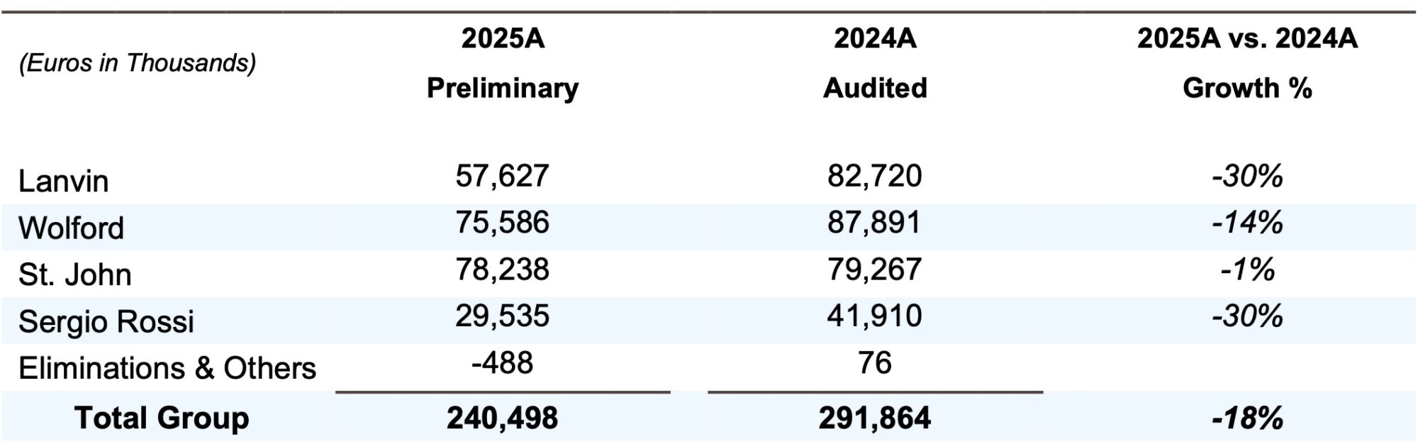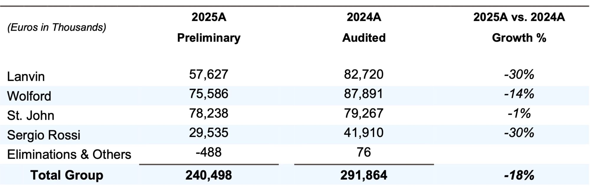The Group navigated a challenging market environment in FY2025: Amid continued volatility in the global luxury market in 2025, Lanvin Group advanced a series of strategic initiatives aimed at strengthening its long-term positioning and improving operational efficiency. Excluding the Caruso business(1), the Group reported preliminary revenues of €240.5 million, representing an 17.6% decrease year-over-year. While the overall performance reflected ongoing industry headwinds and softer consumer demand in certain markets, the Group made meaningful progress in executing its transformation initiatives, including cost discipline measures, retail network optimization, and organizational adjustments across its brand portfolio. Revenue trends improved sequentially in the second half of the year, reflecting early benefits from these actions.